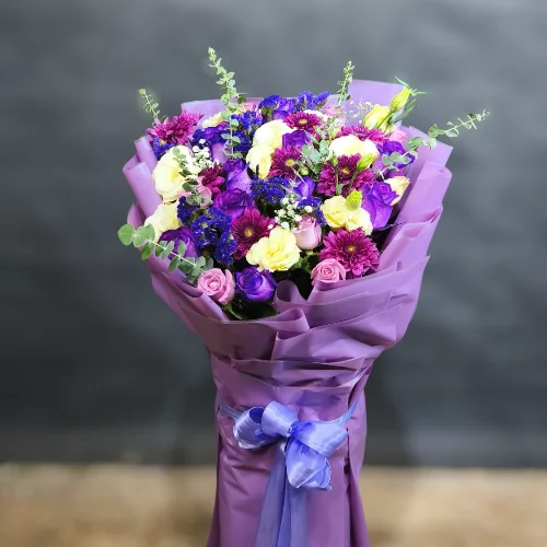 حضور گلهای باکیفیت مانند رز، لیسیانتوس و داوودی در کنار برگهای سبز و تزئینی اکالیپتوس، به این دسته گل جلوهای لوکس بخشیده است. همه این زیباییها در یک بستهبندی شیک و مدرن با کاغذهای بنفشرنگ پیچیده شده و با یک روبان زیبا تکمیل میشود.