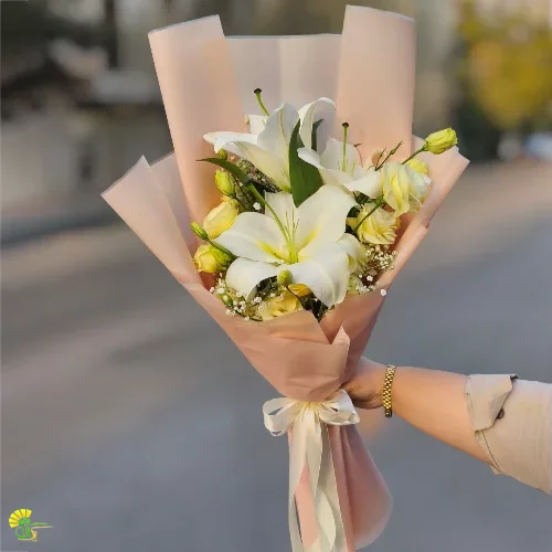 دسته گل لیلیوم که شامل گلهای لیلیوم سفید و گل رز هلندی زرد می شود از آن ترکیبهای دلنشینی است که با یک نگاه، حالوهوای دل را عوض میکند. گلهای لیلیوم سفید با رایحهای لطیف و دلنشین در کنار رزهای شاد و پرانرژی، نماد عشق بی پایان، دوستی و امید هستند. این دسته گل زیبا با کاغذ صورتی و روبان سفید تزئین شده و حس لطافت و سرزندگی را همزمان منتقل میکند.