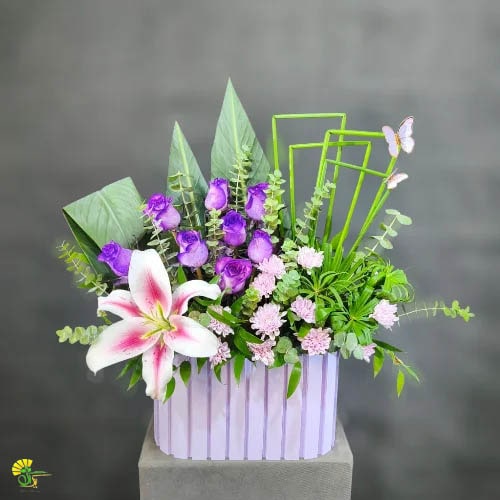 باکس گل "ارشیا" فراتر از یک هدیه ساده، یک اثر هنری است که احساسات شما را به زبان زیبایی بیان میکند. در این باکس گل هدیه، گلهای رز هلندی بنفش، در کنار گلهای داوودی و گل لیلیوم قرار گرفتهاند. ترکیب آنها با برگها و آیتم های تزیینی، ترکیب جذاب و چشم نوازی را ساخته اند.
