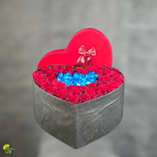 باکس گل قلبی رز قرمز و آبی