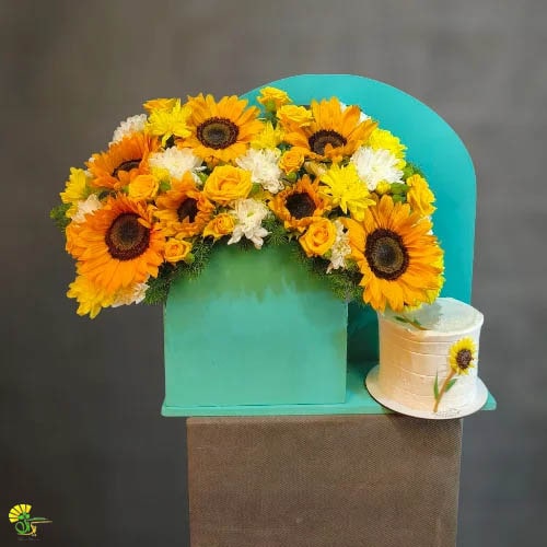 این گلآرایی هنرمندانه در یک باکس خاص به رنگ آبی فیروزهای قرار گرفته که تضاد رنگی فوقالعادهای با زردی گلها ایجاد میکند. در کنار این زیبایی، یک کیک تولد تازه با تزئین گل آفتابگردان قرار دارد که این پکیج را به یک هدیه کامل و بینقص تبدیل کرده است.