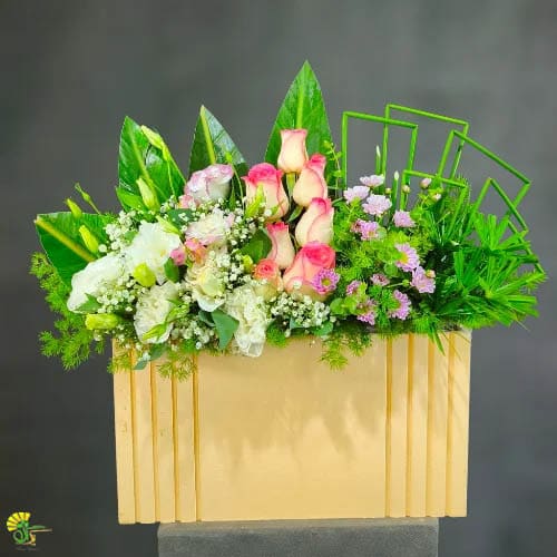 یک باکس گل لاکچری و خاص با طراحی مدرن و گلآرایی فاخر، شامل رزهای دورنگ و گلهای لیسیانتوس و داوودی در باکس چوبی شیک. بهترین انتخاب برای گل خواستگاری، سالگرد ازدواج و هدیههای رسمی در مشهد.