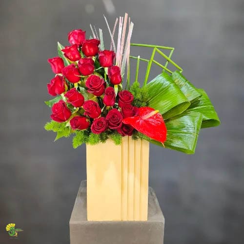باکس گل لاکچری و شیک، شامل رزهای قرمز هلندی و گلهای آنتوریوم در باکس کرمی. طراحی مدرن و ساختارمند برای هدیه به افراد مهم و ارزشمند زندگیتان. خرید گل در مشهد با تضمین کیفیت عالی و ارسال ویژه توسط پیک گل آنلاین.