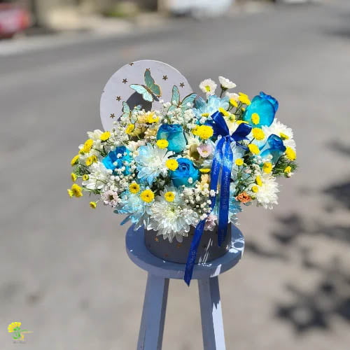 جار گل کد ۲ فانتزی و شاد با رزهای آبی، گل داوودی سفید و گلهای زرد. دارای تزیین ربان و پروانه. مناسب برای تولد، روز دوست و هدیههای خاص. خرید گل در مشهد با طرحی متفاوت و ارسال سریع از پیک گل آنلاین.