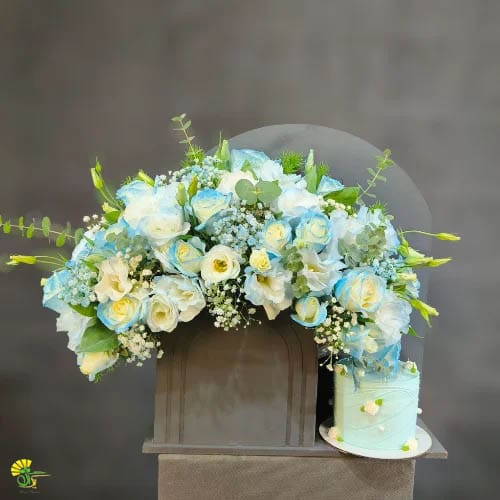باکس گل و کیک ما با تم رنگی آبی-سفید، نماد آرامش، صداقت و وفاداری است. ترکیب گل های لیسانتوس و رزهای خاص آبی و سفید در کنار گلهای ژیپسوفیلا، فضایی رویایی و آسمانی را خلق کرده است. این دیزاین، به خصوص برای خانمها و آقایانی که به رنگ آبی علاقه دارند، انتخابی فوقالعاده است.