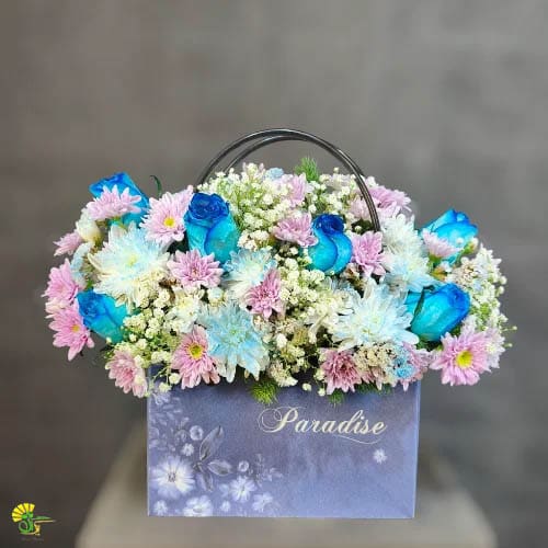 این باکس گل شیک با دقت و ظرافت تمام، برای ایجاد یک حس بهشتی طراحی شده است. تمرکز این دیزاین بر روی گل رز آبی است که در کنار گلهای داودی سفید و صورتی و مقدار زیادی ژیپسوفیلا، جلوهای رؤیایی پیدا کرده است.