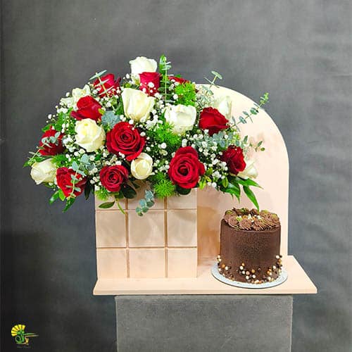 در طراحی این محصول، ما از ترکیب کلاسیک و همیشه برنده رزهای قرمز و سفید استفاده کردهایم. گلهای رز قرمز نماد عشق آتشین و رزهای سفید نشاندهنده پاکی و احترام هستند. قرارگیری این گلها در کنار برگهای سبز تازه و گلهای عروس (ژیپسوفیلا)، جلوهای لوکس به این پکیج هدیه تولد بخشیده است. باکسِ پنلیِ کرمرنگ با طراحی مدرن، جایگاه ویژهای برای کیک تعبیه کرده است که آن را از سایر باکسهای گل معمولی متمایز میکند.