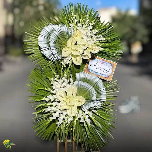 اولین چیزی که در این پایه گل جلب توجه میکند، ساختار دو طبقه و ارتفاع بلند آن است. برخلاف تاجگلهای معمولی یک طبقه، این مدل به دلیل استفاده از برگهای نخل (پالم) در پسزمینه و چیدمان شعاعی، فضایی بسیار بزرگ و حجیم را اشغال میکند. این ویژگی باعث میشود که تاج گل شما در شلوغترین مراسمها نیز "دیده شود" و ابهت خاصی به ورودی مجلس ببخشد. استفاده از برگهای نقرهای رنگ، جلوهای مدرن و متفاوت به این تاج گل ترحیم داده است.