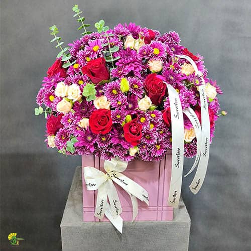 در طراحی این باکس گل هدیه، هیچ چیز تصادفی نیست. ترکیب رزهای قرمز(نماد عشق آتشین) با گلهای داوودی بنفش و ارغوانی (نماد اصالت و صمیمیت) و رزهای مینیاتوری نباتی، یک شاهکار بصری خلق کرده است.
