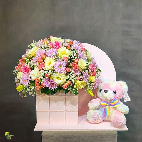 اگر به دنبال یک هدیه ولنتاین در مشهد هستید که قرمز نباشد، این باکس انتخابی هوشمندانه است. خرس عروسکی نماد صمیمیت است و گلهای معطر، پیام عاشقانه شما را کامل میکنند. این باکس گل هدیه برای قرارهای عاشقانه و سالگرد آشنایی نیز بسیار پرطرفدار است.