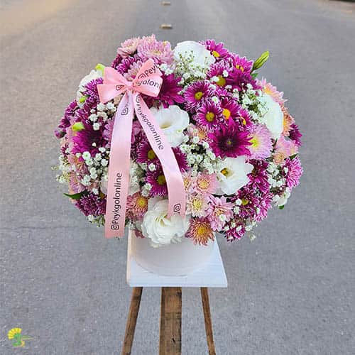 یکی از مزیتهای اصلی گل داوودی، عمر طولانی آن است. این گلها در کنار لیسیانتوسهای تازه، اگر در جای خنک نگهداری شوند، روزهای متوالی شاداب باقی میمانند. این ویژگی آن را به یک باکس گل هدیه عالی برای تولد، عیادت بیمار (به دلیل انرژی رنگها) و یا تشکر از یک دوست تبدیل کرده است. روبان صورتی برند شده روی کار، جلوه کادویی آن را تکمیل کرده است.