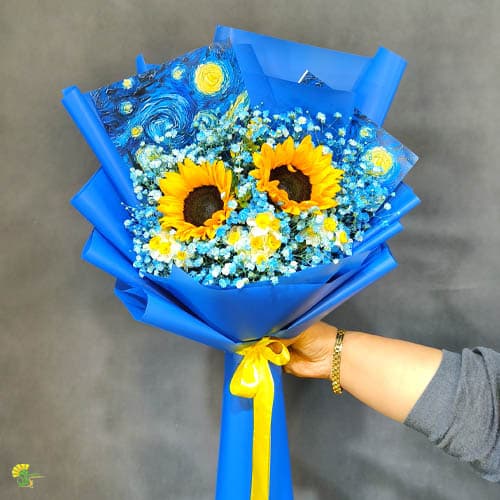 این محصول دقیقاً بازسازی تابلوی "Starry Night" است. در این دسته گل شب پر ستاره، گلهای ژیپسوفیلا (عروس) با رنگآمیزی آبی لاجوردی و فیروزهای، آسمان پر تلاطم ونگوگ را تداعی میکنند. در میان این آسمان آبی، گلهای آفتابگردان درشت و زرد، درست مانند ستارهها و ماه در آن شب رویایی میدرخشند. کاغذ کادوی این دسته گل نیز با چاپ باکیفیت همین نقاشی انتخاب شده تا هارمونی بصری بینظیری ایجاد کند.