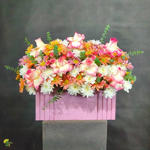 در این دیزاین، ما از رزهای لب صورتی درشت و باکیفیت استفاده کردهایم که نماد سپاسگزاری و تحسین هستند. اما زیبایی کار همینجا ختم نمیشود. ترکیب این رزها با گلهای داوودی سفید و نارنجی و رزهای مینیاتوری، طیف رنگی گرم و انرژیبخشی را ایجاد کرده است. اگر قصد خرید باکس گل را دارید که انرژی مثبت را به فضا تزریق کند، این ترکیب رنگی دقیقاً همان چیزی است که نیاز دارید. باکس چوبی صورتی رنگ نیز لطافت و زنانگی این کار را تکمیل کرده است.