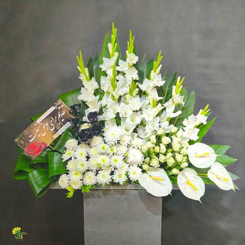 در طراحی این پایه گل مشهد، تمرکز بر رنگ سفید است که نماد پاکی و آرامش روح است. همانطور که در تصویر مشاهده میکنید، ستونی از گلهای گلایل سفید در پسزمینه، حس عروج و بلندی مرتبه را القا میکند. در بخش پایینی، انبوهی از گلهای داوودی سفید و آنتوریومهای براق چیده شدهاند که حجم و شکوه کار را دوچندان کردهاند. استفاده از چند شاخه رز مشکی در مرکز کار، تضادی غمانگیز و در عین حال بسیار شیک ایجاد کرده که نشاندهنده عمق اندوه شماست.