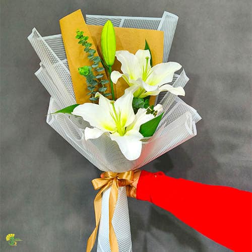 در طراحی این محصول، اصل "زیبایی در سادگی است" رعایت شده است. شاخههای تازه و بلند گل لیلیوم سفید در کنار برگهای سبز اکالیپتوس قرار گرفتهاند. استفاده از کاغذ پیچپیچی مشبک سفید و کاغذ کرافت در لایههای زیرین، به همراه یک روبان طلایی ساتن، ظاهری مدرن و بسیار لوکس به این دسته گل بخشیده است. اگر به دنبال یک دسته گل شیک برای مراسم خواستگاری، تبریک نامزدی یا حتی عذرخواهی رسمی هستید، این دیزاین مینیمال تأثیرگذاری کلام شما را دوچندان میکند.