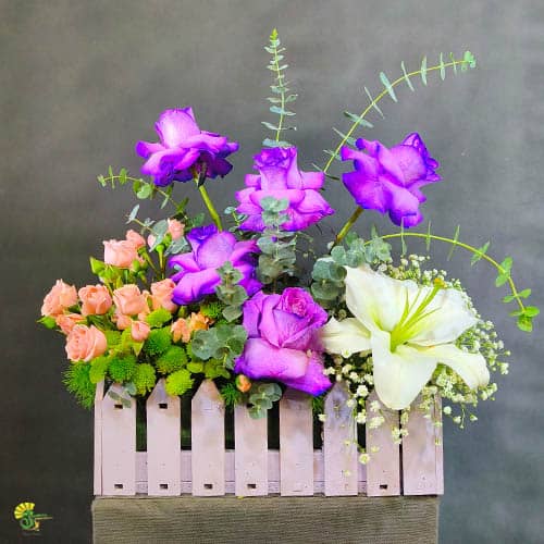 برخلاف جعبههای مقوایی معمولی، این مدل از یک باکس چوبی با طرح پرچین (نردهای) به رنگ بنفش ملایم بهره میبرد. این انتخاب نه تنها ماندگاری فیزیکی هدیه را بالا میبرد، بلکه حس حضور در یک باغچه با طراوت را به گیرنده منتقل میکند. اگر به دنبال جدیدترین باکس گل بازار هستید که بعد از خشک شدن گلها نیز به عنوان یک اکسسوری دکوراتیو استفاده شود، این گزینه ایدهآل است.