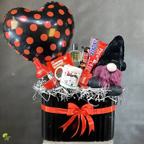در مرکز این باکس، یک عروسک لیلیپوت (Gnome) با کلاه مشکی و ریش بنفش خودنمایی میکند. در کنار آن، یک ماگ سفید با تصویر کارتونی عاشقانه قرار دارد که هر بار نوشیدن چای یا قهوه را به یک یادآوری شیرین تبدیل میکند. همچنین یک بادکنک قلبی بزرگ با طرح خالخالی قرمز و مشکی، هیجان بصری هدیه شما را تکمیل کرده است.