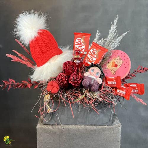 ما در این باکس شکلات و عروسک، برترین برندها را کنار هم آوردهایم. شکلاتهای KitKat و Tickers در کنار یک شیشه عشق کوچک، پیامآور شیرینترین لحظات برای شما هستند. این تنوع خوراکی در کنار گلهای رز قرمز روبانی، تمام آن چیزی است که برای یک شب رویایی نیاز دارید.