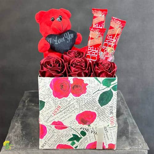 خرید کادو ولنتاین مشهد کد v35 | باکس هدیه شامل گل، شکلات و عروسک